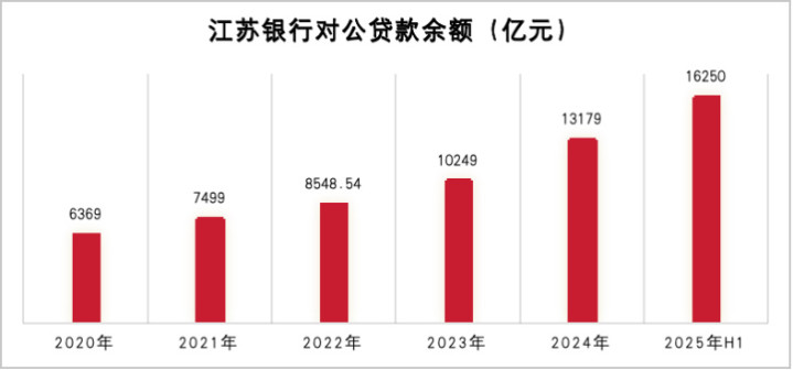 2020年末-2024年末,江苏银行的对公贷款余额从6369亿元攀升到13179亿元,四年增长一倍还多。